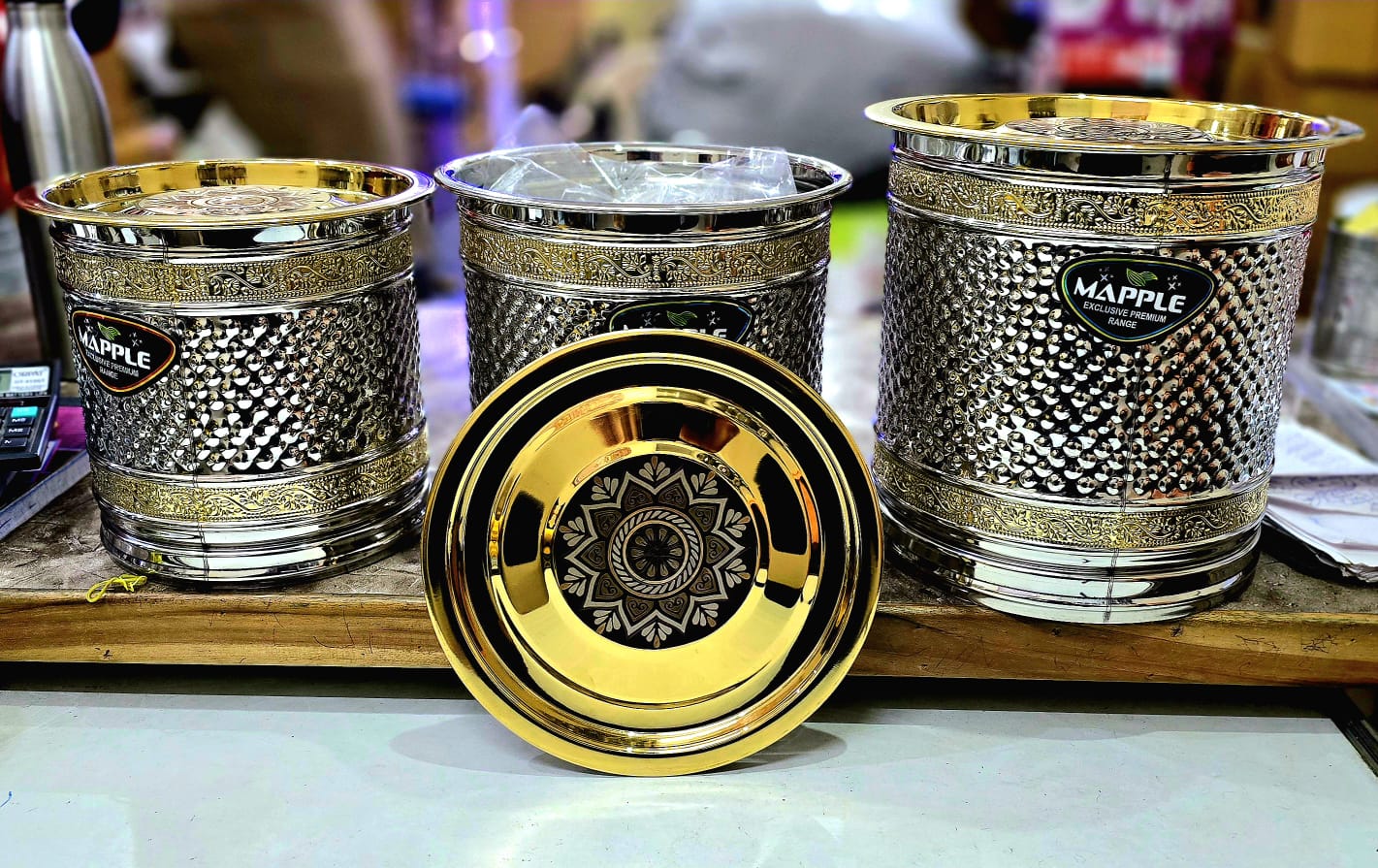 Set Includes: 3 containers with lids + 1 decorative golden plate